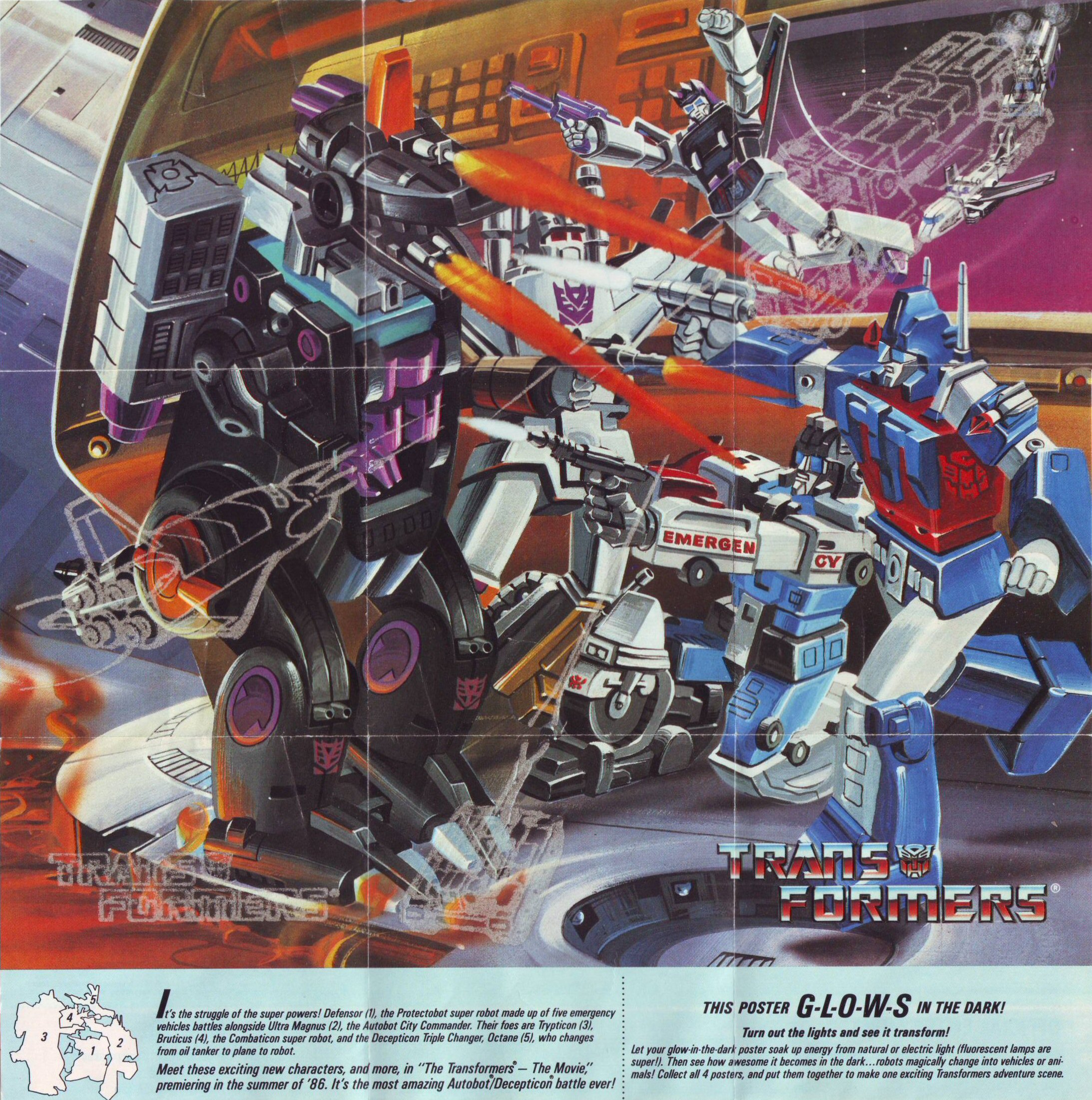In 1986 Hasbro began including glow in the dark posters with many Transformers toys as part of the lead up to Transformers: The Movie. Many 1985 toys were later available with the yellow triangle in the corner advertising the poster and sweepstakes. I think most if not all of the 1986 toys started out with the offer, and were then later available without the offer, but I was unable to locate a list of which toys had the offer on the box. There were 4 posters in all, each a part of a larger scene shown on the back (all four had identical backs).