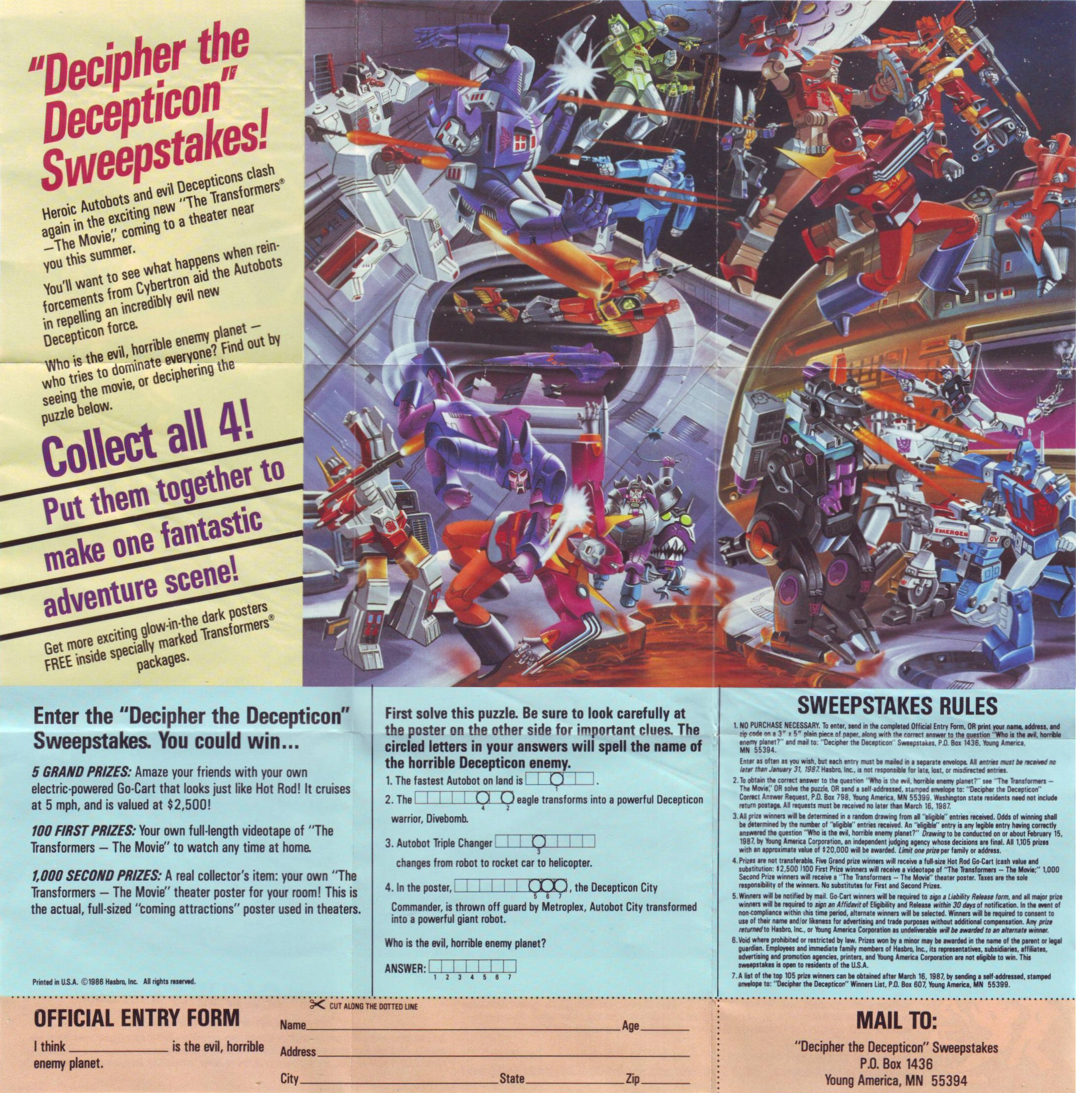 On the back was the entry form for the Decipher the Decepticon Sweepstakes. The most notable thing about the sweepstakes is that there were five grand prizes, the famous (or infamous) Hot Rod Go-Karts.