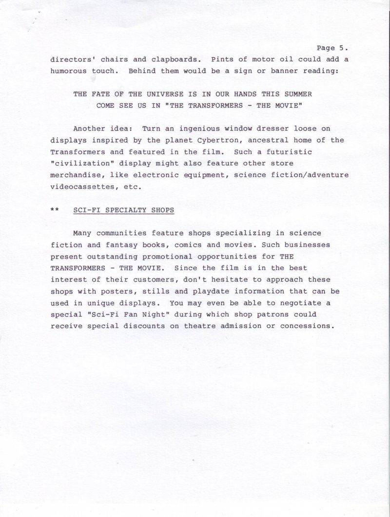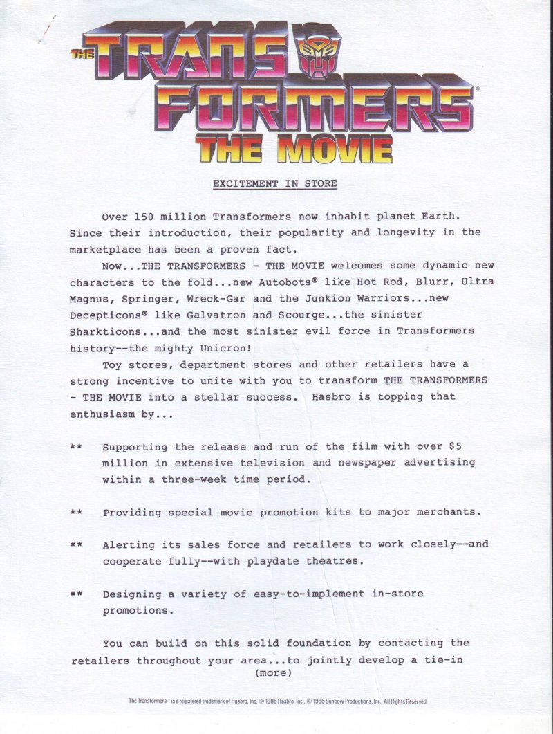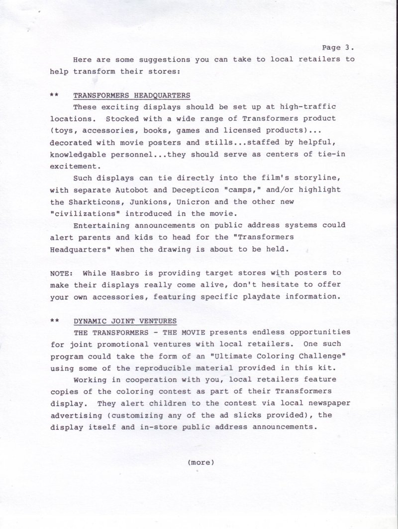 This packet talks about toy promotions and merchandise promotions in retail stores. What I find interesting here is that while talking about toys they mention Unicron. Guess they didn’t get the memo.