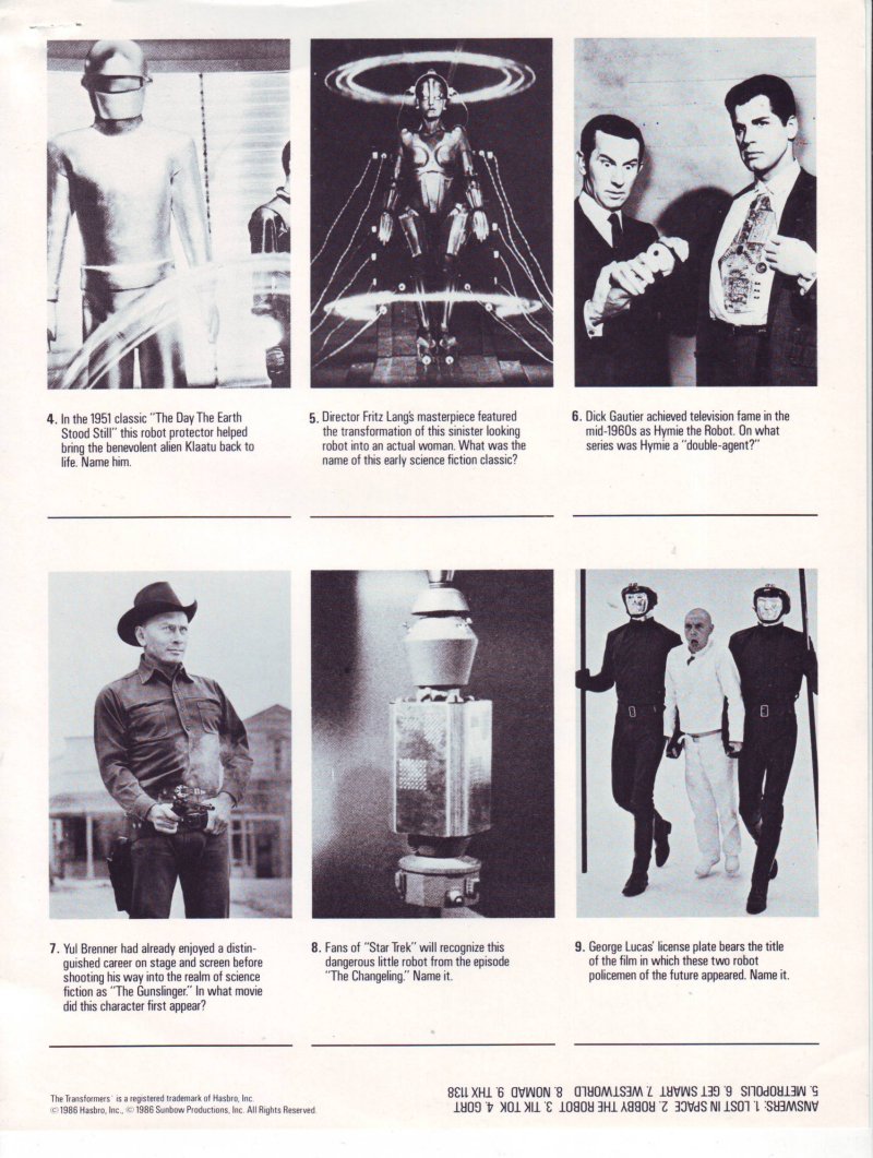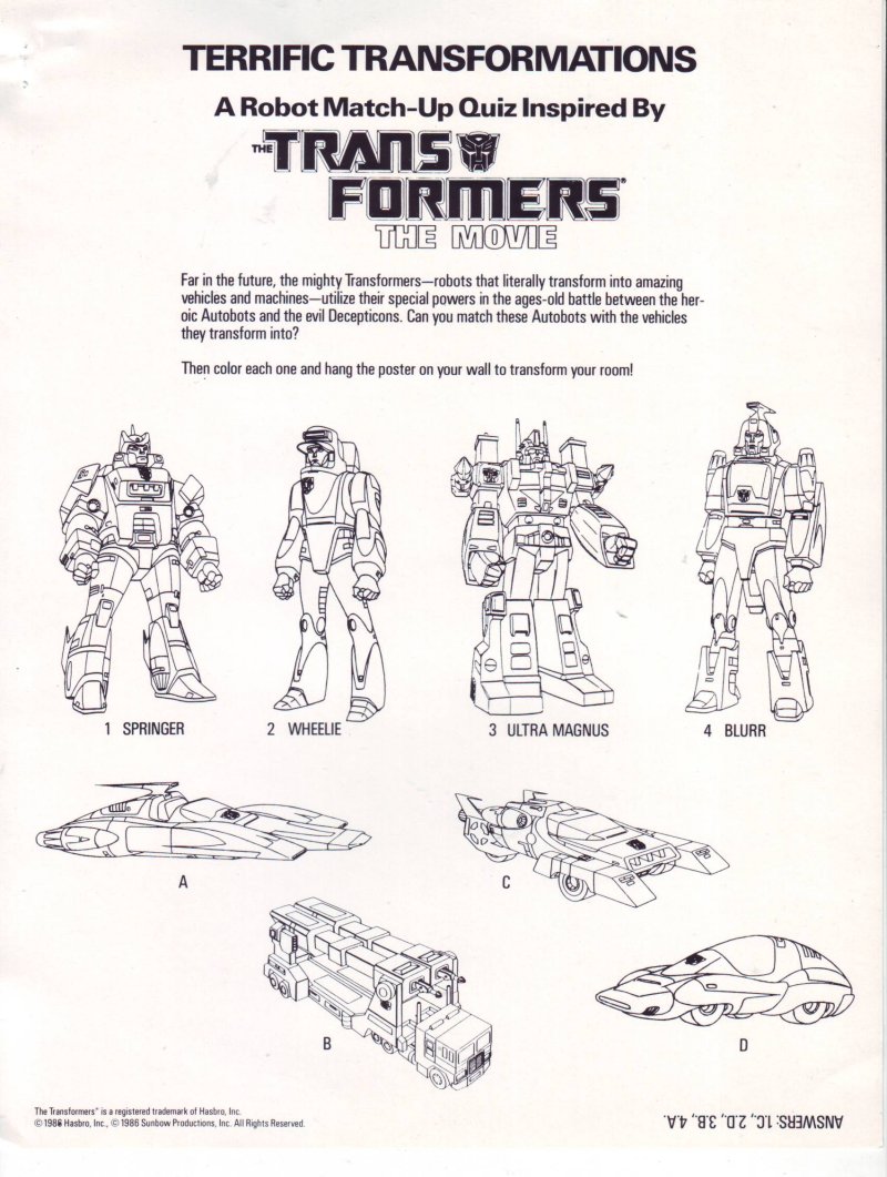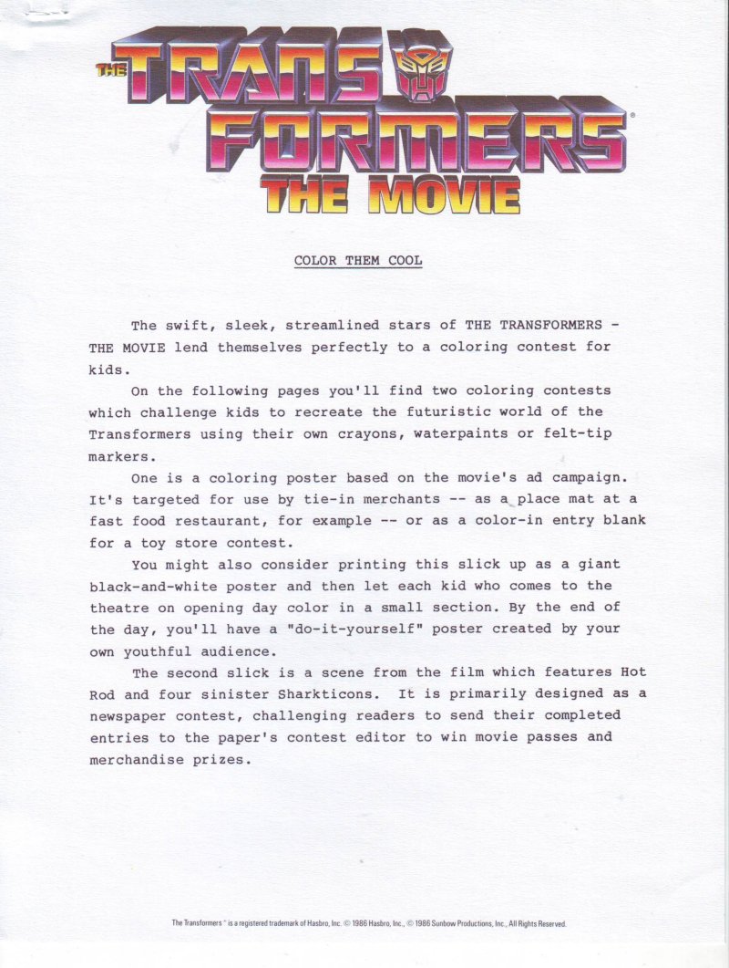 This page is all about the Glow-In-The-Dark Poster promotion and talks about the infamous Hot Rod go cart. I did a blog on the posters not too long ago. Oddly it does not use the name, “Decipher The Decepticon Sweepstakes.” It says right at the beginning, “As you read this news, millions of special THE TRANSFORMERS – THE MOVIE sweepstakes posters are on their way to the youth of America…” It is likely that this packet was put together ahead of time, before they named the promotion. I don’t have another explanation.
