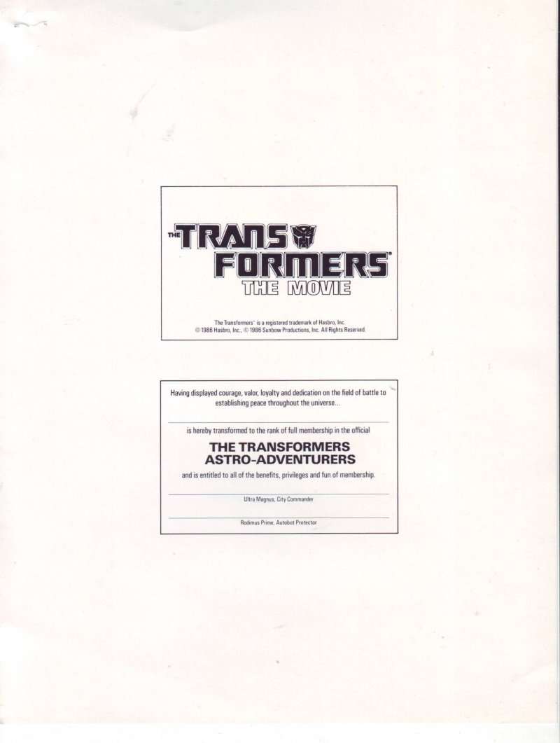 This page talks about the Movie Edition G1 Optimus Prime. It does not mention a Movie Edition Megatron, but I know there was one. I assume this is the order form they are talking about, as it is the only offer I’ve ever seen for the Movie Edition Optimus or Megatron with your movie ticket stub instead of robot points. It also mentions a “poster snipe.” I’m not sure what a poster-snipe is, unless it refers to it coming free as part of the order form. The order form does include the poster, but it also includes coupons to get the poster with your Transformers: The Movie ticket stub and $1.00. That poster is the same as the one on the order form, accept it does not have the order form attached or anything printed on the back. You can see that poster here.