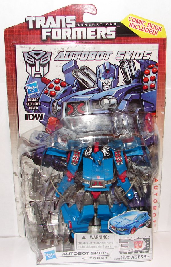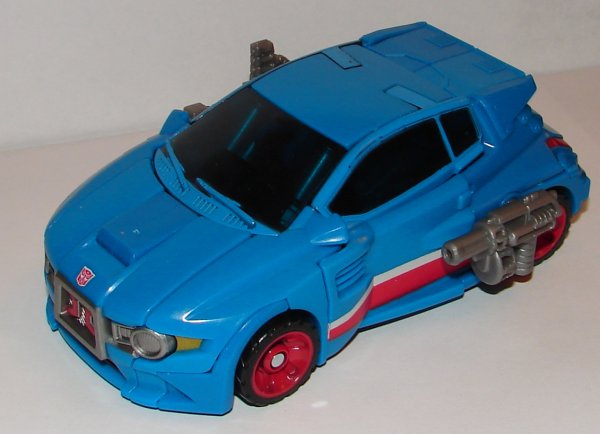 Vehicle Mode: I really like Skids vehicle mode. I’m not crazy about the red painted hub caps, I’d have rather they put some additional white and red stripes on the hood and roof, but it doesn’t look bad. He has two different guns that mount on the sides of the car. Unfortunately, one is smaller than the other, but it’s better than only having a gun for one side. I did have a little trouble getting the side panels of the cars to stay in place. It could have used a tab to snap in place. I will be interested to see if the planned Crosscut repaint has that fixed.