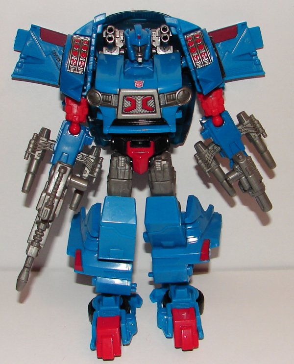Robot Mode: The red, blue, and gray color scheme looks awesome on him. He’s absolutely armed to the teeth with guns on each side of his wrist, and two on each shoulder, plus his hand guns. I really like this one.
