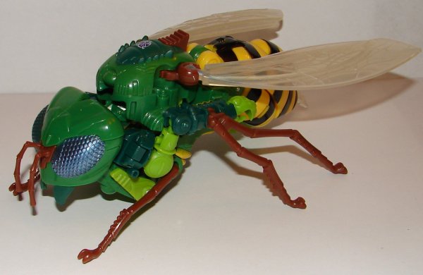 Vehicle Mode: It’s taken seventeen years, but Hasbro has finally produced a nearly perfect Waspinator toy. His insect mode is amazing and so much better than the original Beast Wars toy. They did a great job hiding his robot parts in bug mode, the lone exception being his hands beside his abdomen (I think that’s what it is). He appropriately has a Predacon symbol, and there is a switch on his back to make his wings flap.