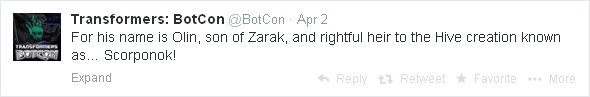 Okay, so, we start off with the announcement. It’s Scorponok and he has a Nebulon, with the obvious suggestion that he is a Headmaster. They call him “Olin, son of Zarak”. In a later tweet they called in Olin Zarak (he’s a pirate by the way). Personally, I think you stick to one or the other. He is either “Olin, son of Zarak” (Klingon style) or “Olin Zarak”. It’s a very small thing, but I don’t think the two are interchangeable.