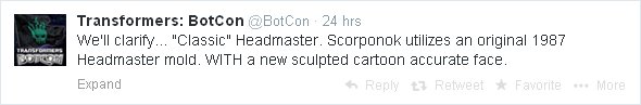Of course, we don’t know how much they might jack up the price of the box set because of this. If it’s a lot, I might have been happier with a straight repaint in Scorponok colors. Only time will tell.