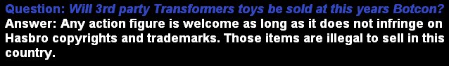 However, the 2014 Botcon FAQ makes no mention of any ban on 3rd party toys as of this posting. So, what does this mean? I have a few ideas.
