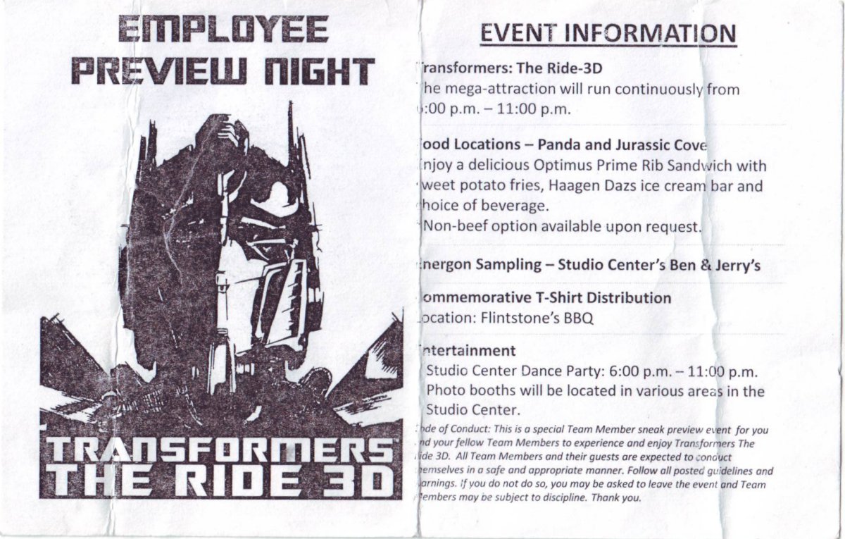 These last two items are from an employee preview night for Transformers: The Ride 3D. This is a schedule for the event. It’s just a photocopy, but I doubt a lot of people kept these. (I’m probably the only one who wants it anyway. 🙂