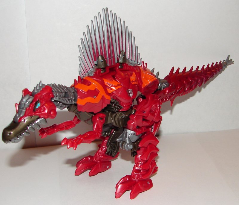 Dinosaur Mode: Awesome! Scorn looks amazing in dinosaur mode, as a Spinosaurus, the dinosaur made famous by Jurassic Park III. (I say made famous since I’d never heard of a Spinosaurus before JPIII.) Aside from the obvious problem of being in completely different colors than they are going to be in the movie, he is beautifully painted. I love the spines on his back and his dinosaur head is perfect.
