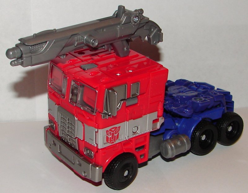 Vehicle Mode: At long last, the mode we’ve all been waiting for! Movie Optimus Prime finally has a G1 alternate mode. And yet, they couldn’t even get him to be these colors in the movie, meaning a white repaint is almost a foregone conclusion. That’s Hasbro for you. That aside, I so love the vehicle mode. An excellent G1 square cab. Unfortunately, it has a major design flaw. It’s Hasbro, what did you expect? As you can see in the picture above, the windows of his cab are three panels, two side panels, and a center panel connected to his upper grill and the center of the roof. There is no tab or peg to keep the middle panel in place. Unless you hold it in place it won’t stay lined up. This is an obvious flaw and it is inexcusable that it was not fixed during the design process. It takes a lot for this otherwise awesome toy.