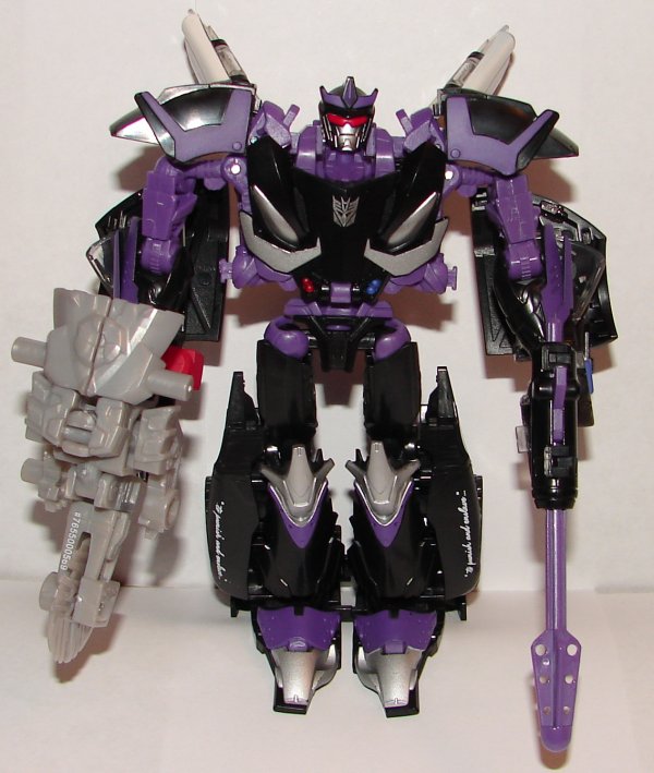 Barricade is absolutely awesome. He is a repainted Transformers Prime Beast Hunters Deluxe Prowl. He did not need a new head as the existing one does look a bit like Barricade, though without that homicidal expression he wore in the movie. He even has his Decepticon police shield and “to punish and enslave” on his fenders. The purple, black, and silver look great on this mold.