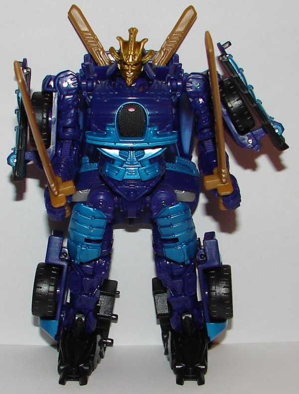 Robot Mode: Drift looks great in robot mode. I’m still not sure whether I like that human-like face or not. The head sculpt is nice though. He is meant to look like he is wearing samurai armor. It kind of looks like it is in some ways, but it’s not perfect. It’s hard to do in a deluxe size toy. There is still one Leader Class toy yet to be announced (though it may have been announced at Botcon this weekend, I have not yet read the reports). I would love to have a Leader Class Drift.