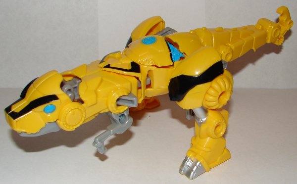Bumblebee’s dinosaur mode looks okay, but his robot mode is awful. He has no real feet to speak of, basically standing on the open dinosaur jaws with the lower jaw halves as his heels. He doesn’t stand well at all.