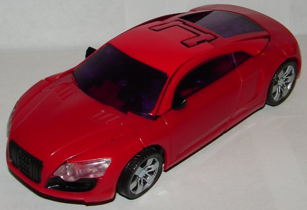 Vehicle Mode: The USA was denied a number of toys from the end of the completely mishandled Dark of the Moon Line, but Leadfoot, Soundwave, and Queue eventually showed up online if you were willing to shell out the cash for them. They also had Japanese versions if you weren’t particular about getting the intended USA versions. However, poor Dino only got a repainted Legend toy they called Mirage. Sideways was a good mold choice for Dino. He’s nicely painted, though his roof doesn’t quite match the red of the rest of the car body. Unlike the other Movie Advanced toys that got new weapons, his blades connect on the underside of the vehicle.