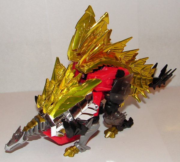 As with Grimlock, some of his silver chrome looks bronze in the picture. His entire dinosaur head is silver chrome, as are the sides of his body. He has the red horns, though a lot more of them than G1 Slag. In robot mode he has the same red chest.