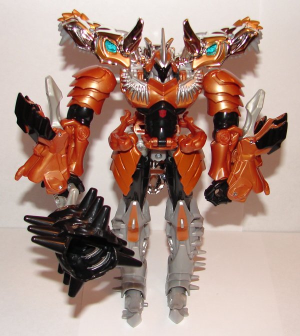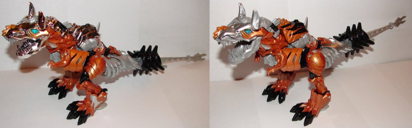 Grimlock has no mold changes and is basically the same as the regular release with a few exceptions. Chrome was added on his head, lower jaw, back of his neck, and on his back. He has a silver paint app on the outside of his dinosaur ankles. This version has a black face instead of silver, which I do not like at all. The silver face looks much better.