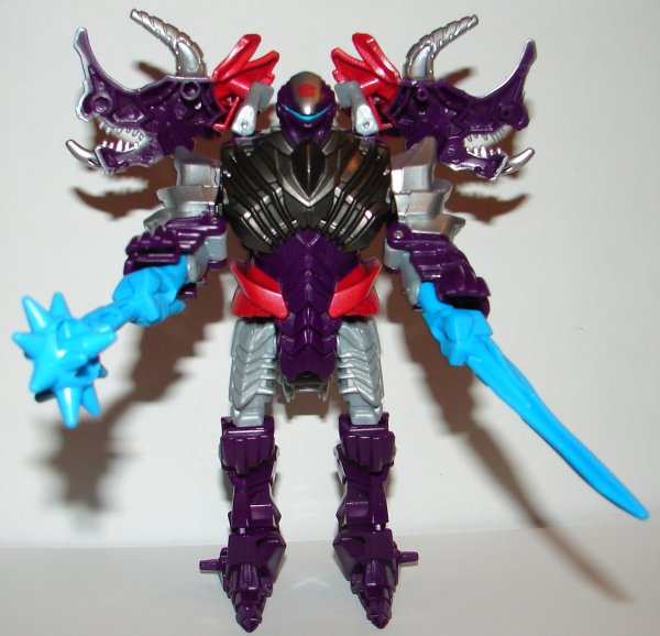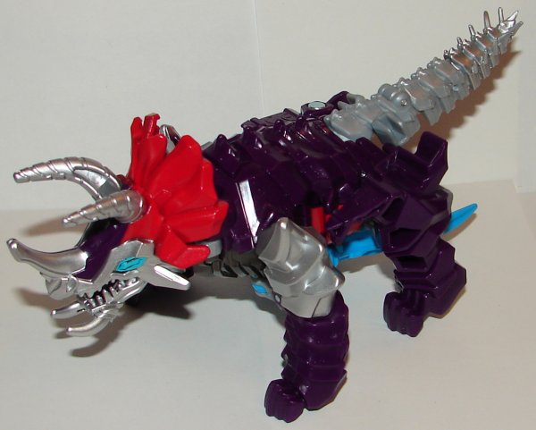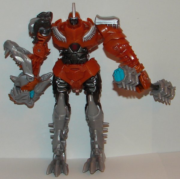 His tail ends in a fist holding a weapon. Other than that glaringly stupid design element, he looks pretty good in dinosaur mode. His robot mode is okay, but his right arm is terrible. His action feature is his fist spinning with his weapon in it. The weapon is badly designed. Each end can slide out to make the shaft longer, if you’re spinning it, it’s fine. But if you’re not spinning it, there is nothing to lock them in place. So when it’s not spinning the end on top stays in the short shaft position and the one on the bottom in the long position. They should have been able to look in either position.