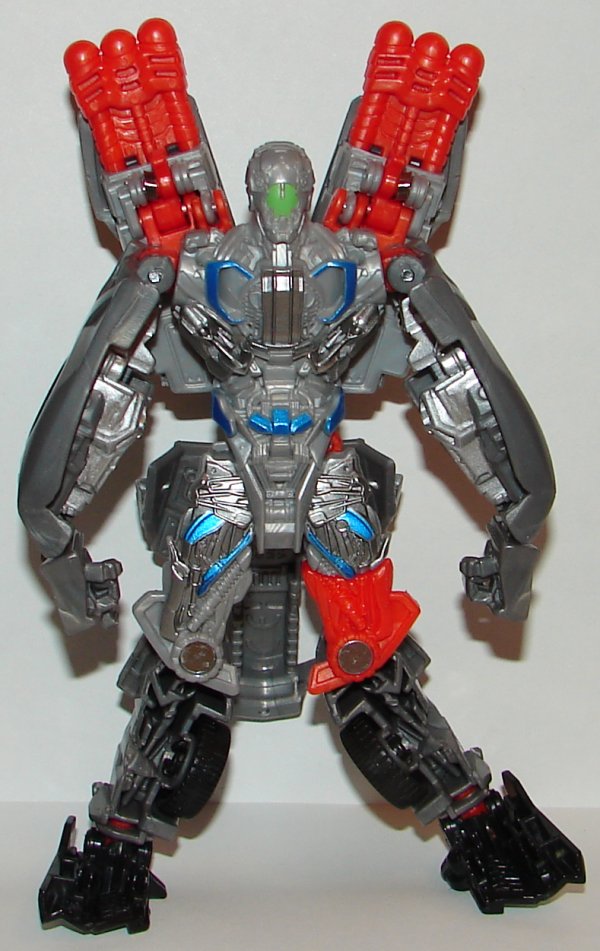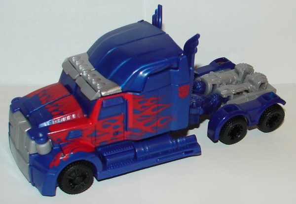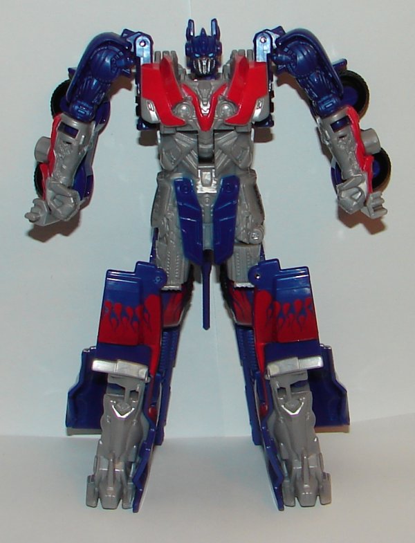 Optimus Prime looks really great in both modes. Unfortunately his action feature is awful. If you squeeze his legs together, his shoulders pivot out 90 degrees. His chest tips forward pulling another set of arms over his head holding a sword. Not only is it stupid that he has a second set of arms, but it just doesn’t work very well.