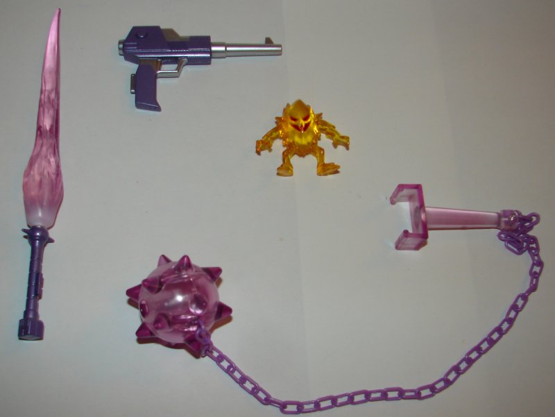 Megatron comes with his Energon Sword (from Transformers: The Movie), his energy Mace (from More Than Meets The Eye), a laser gun (from Transformers: The Movie), and a small Kremzeek figure. Pretty much the same as the original version of MP Megatron, though I don’t have mine handy to compare.