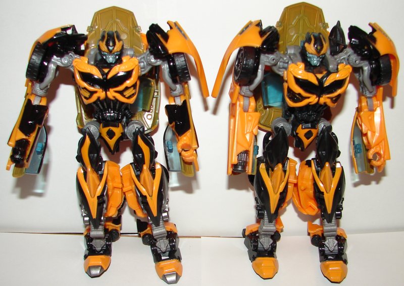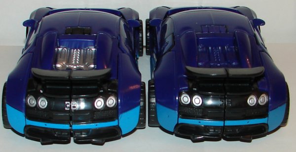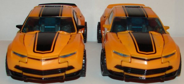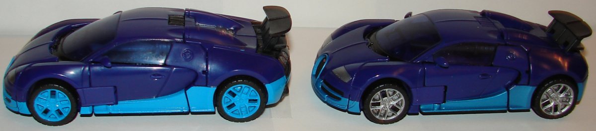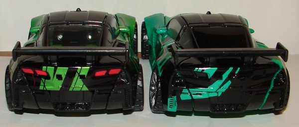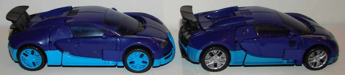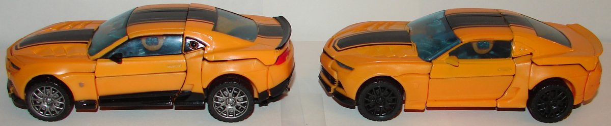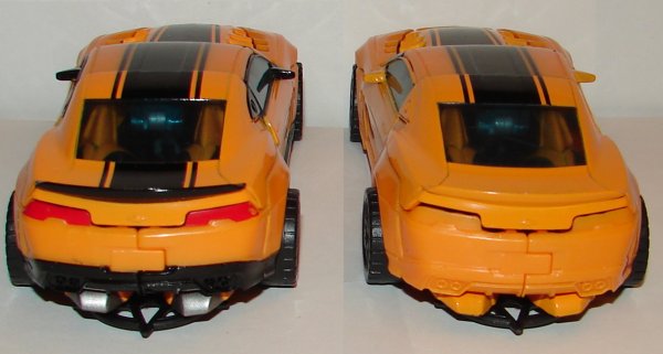 In robot mode, the new version has silver toes, silver on the sides of his legs, and silver pistons on his torso. He has yellow stripes on his thighs and sides of his chest. He has black striping on his arms and arm cannon. In vehicle mode he has silver hub caps and silver logos on the sides of the vehicle. He’s got black on the small triangular windows behind his doors, rear bumper, and rear spoiler. Also the black striping on his hood and roof are continued onto his trunk (and it is unforgivable this wasn’t done on the original). They also painted his taillights.