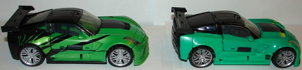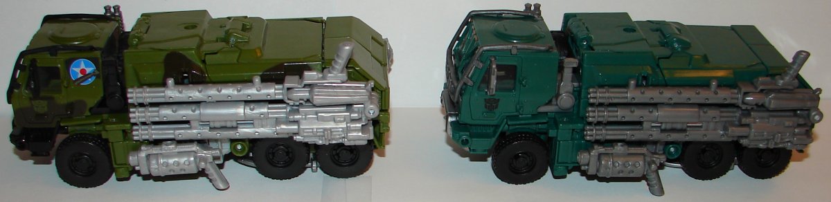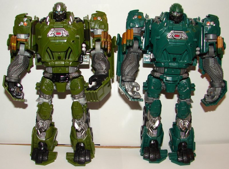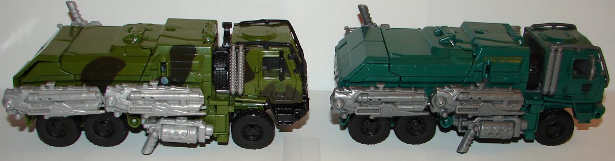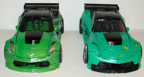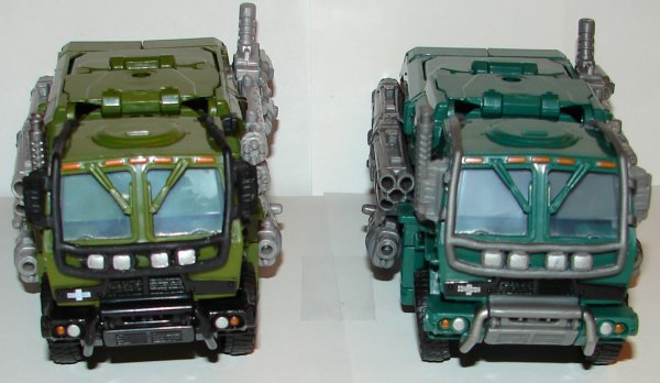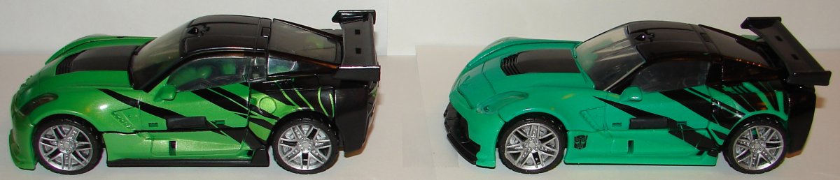 His overall green color has been changed. I really like it. In robot mode the new version has green feet silver toes and darker silver on his knees and thighs. His torso is green with dark silver and red. He’s got a red Autobot logo on a black patch on his chest. He’s got blue eyes with silver goggles. They added black striping on his forearms and red paint apps on his arms, and more black on his shoulders. In car mode, they changed the black striping patter and continued it on both sides of the vehicle. His seats and black and his front bumper is now green with a patch of black. They painted the logo on his hood silver. They painted his headlights and taillights.