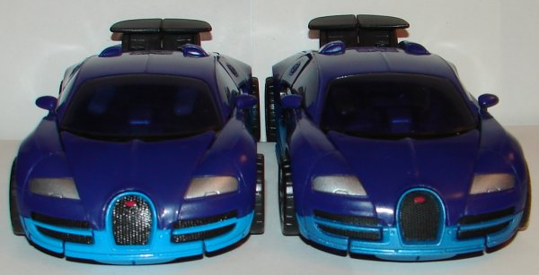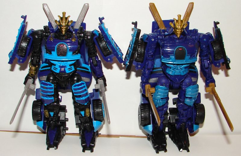 Drift looks sweet! They changed the metallic light blue to a darker richer blue making his two tone color scheme really look nice. His shoulder and thigh samurai pads are now two tone blue instead of just blue. His weapons are gray instead of gold. He has black stripes and a silver vehicle brand logo on his lower torso. His waist is black as well as his upper arms and he has gold on his right forearm. His legs are black with more gold paint apps. His upper chest is also black with some gold apps. They used darker gold on his face and gave him blue eyes, which looks great. In vehicle mode his hubcaps match his lighter blue. Frankly I think the hub caps would have looked better in silver, but it still looks great. His engine is silver, one of the most idiotic things left out of the original version, and they added the silver logo on the back end of the vehicle.