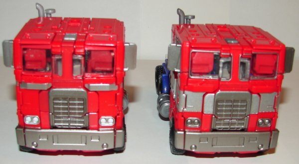 They did a nice job on Optimus Prime. His gray plastic is a lighter gray color, but it would have looked better all in silver. He has silver stripes on his lower legs and thighs and blue on his hips. His grill and headlights are painted silver and there is a G1 style silver stripe across his chest. He’s missing the wide silver stripe beside his head that the regular version had. His fake smokestacks are painted silver. He uses the faceplate head sculpt and it’s perfectly painted. He has a much better looking black gun. His upper shoulders are red and have Autobot logos, and his middle arms are silver. In robot mode they removed the thick silver stripe in favor of a thinner one. Looks cool. Oddly they removed the silver from around his front windows. I kind of liked that, but my guess is they didn’t want to accentuate his hideous design flaw (the sides and center of the truck front still won’t line up, another unforgivable failure on the part of Half-assed-bro). The side of the truck now has Autobot logos in the G1 position. They changed the painting of his small side windows. Some of his blue plastic is now painted blue. This is because of other color changes that required changing plastic colors. This makes the ports on his flat bed red.