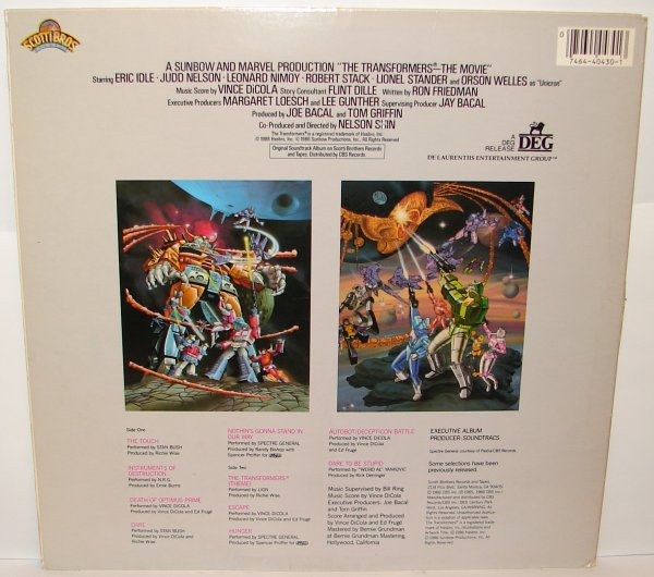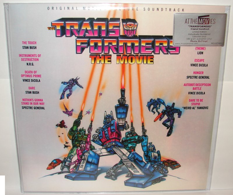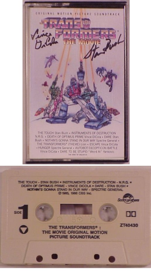 The Transformers: The Movie Soundtrack was also released on cassette in 1986. Mine is autographed by Stand Bush and Vince DiCola. (I feel so cool right now. Please read that as sarcasm.)