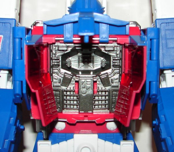 Robot Mode: His robot mode is perfect. I did not realize this until after I took the pictures, but his ankles will bend so he can be stood up straight with his feet together, which is awesome. You can remove the front of his head so you can put in a second face with him screaming. As you can see, under the face they molded a second white Optimus Prime face like the G1 toy (sort of). He’s got a lot of articulation, but not too much. You can put Optimus Prime’s Matrix in his chest. His chest even opens much like it does in Transformers: The Movie. He’s amazing.