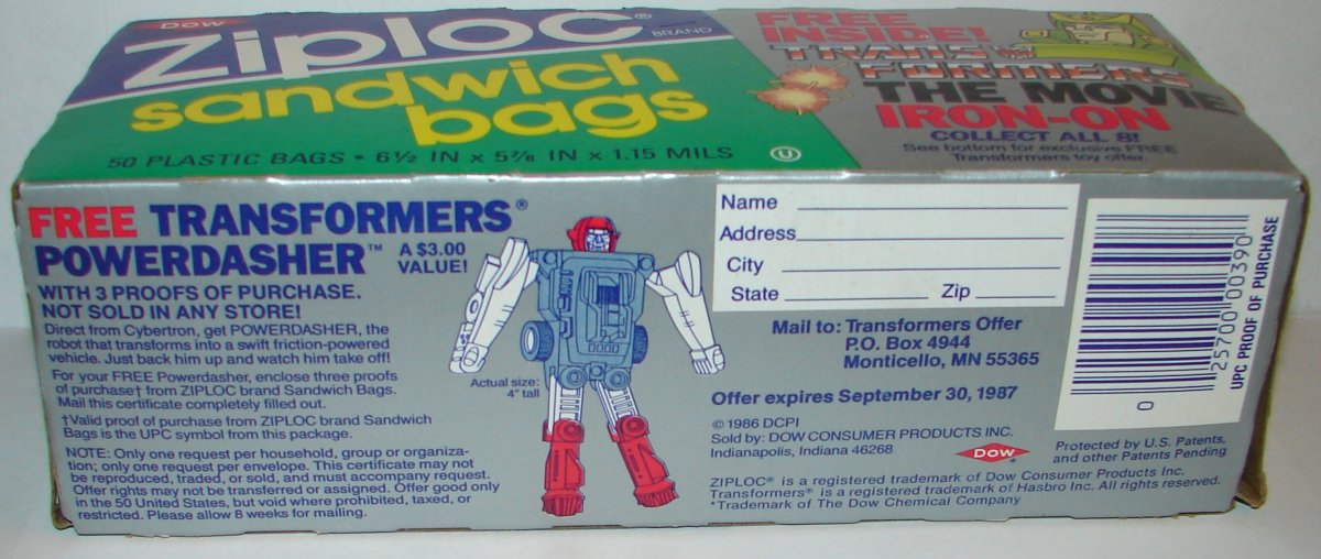 Wow, didn’t know they had a Powerdasher free with only three Ziplock UPCs. The Reinforcements offer was $3 and two Robot Points. Lousy toy, but at least it was a “real” Transformer.