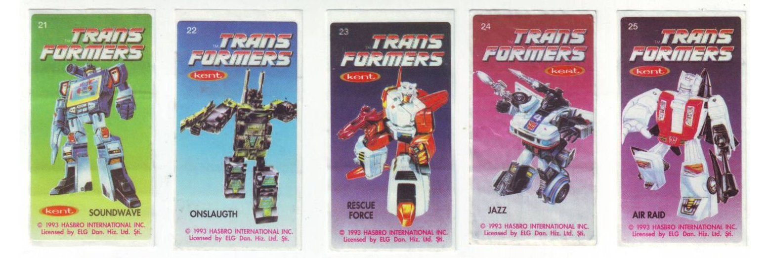 When collecting Transformers, you sometimes have to be in the right place at the right time. A few weeks ago a complete set of 56 1993 Kent Gum Transformers stickers came up on eBay. Kent gum is sort of like Bazooka in the USA, but instead of comics they include stickers wrapped around the gum. I bid on it, expecting to be greatly outbid, but I was the only bidder and they ended up costing me less that $1 each. I’ve never seen a complete set of these on eBay before. They are in overall great shape. A few of them are a bit rough, but if you consider that they came wrapped around chewing gum twenty years ago, they aren’t too bad. I don’t know of all the specific countries that sold the gum. My set came from Ukraine, but I think it was sold in other parts of Europe, though I don’t know for sure. The company was based in Turkey, but has since closed down (I think). The above picture of a piece in wrapper I found on this Russian Transformers Site. There was a sticker book available for the stickers and this site has scans of the entire book with stickers. Unfortunately, I don’t have the book, but I’m looking for it.