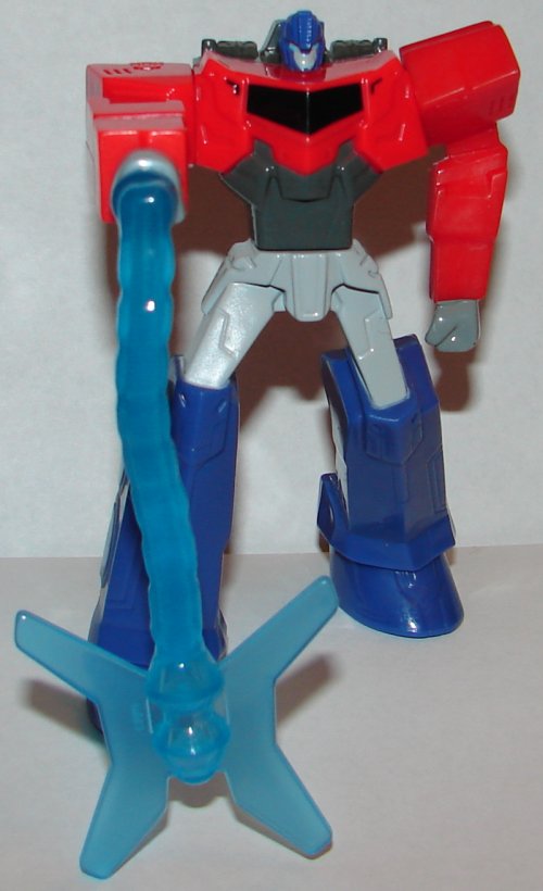 Optimus Prime has a button on his back. You push it and his hand spins with his sword in it. Unfortunately, when it is not spinning, it won’t stay up. Kind of stupid.