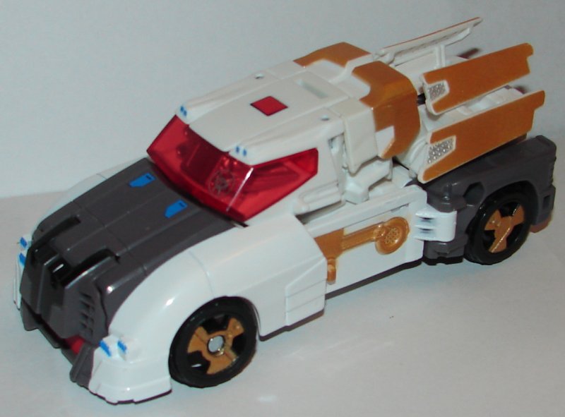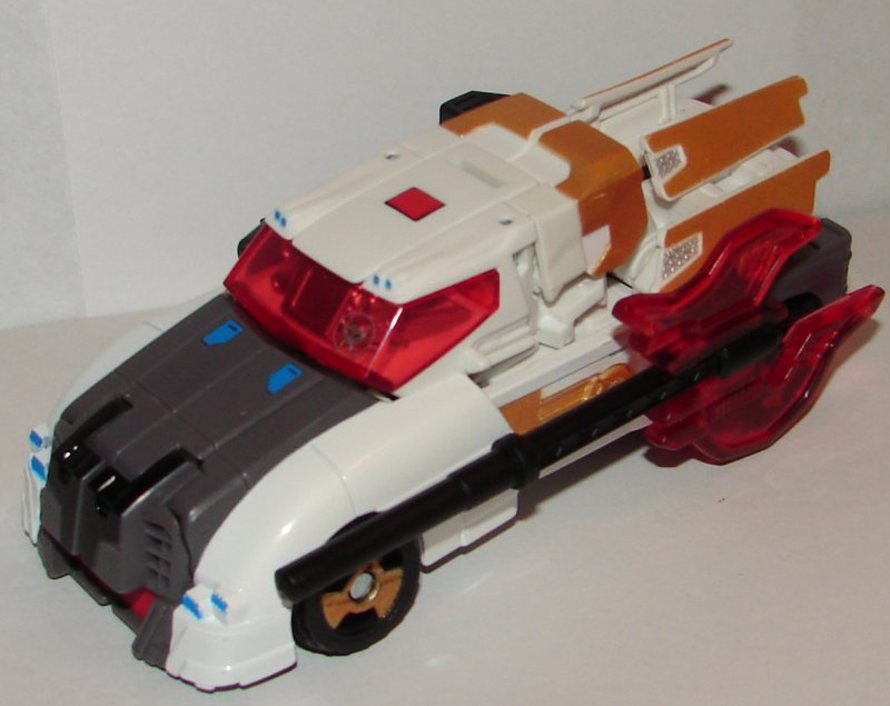 Well, let’s just get this out of the way. Doing Beast Wars characters as vehicles was fine for the Axalon set in 2006, since it made sense that they were vehicles before getting to earth. But painting any old car into a Beast Wars character just for the hell of it doesn’t make sense, and since Lio Prime was not in Beast wars, it makes no sense. That aside, they did a nice job painting him. I like the gold on the rear fins. I suppose you could say it looks vaguely mane-like. The head sculpt, which I talked about extensively in my Nova Prime blog, looks a little better in person, but not much. They kind of cheated, by only painting his outer antenna silver, and leaving the inner one blue so it looks like it’s just part of his head. However, when you look closely, you can see that it clearly looks like it is missing paint. When you try to do too much with a head mold like this so it will look like two different molds depending how you paint it, you end up making both worse off for it. They should have just used the same paint mask in different colors on both and gone with a single antennae instead of the double for Nova Prime, or molded it different and gone the other way. It kind of reminds me how they painted the head on the 2011 club exclusive Sideburn. On paper, it wasn’t a terrible idea, but in practice it falls flat.