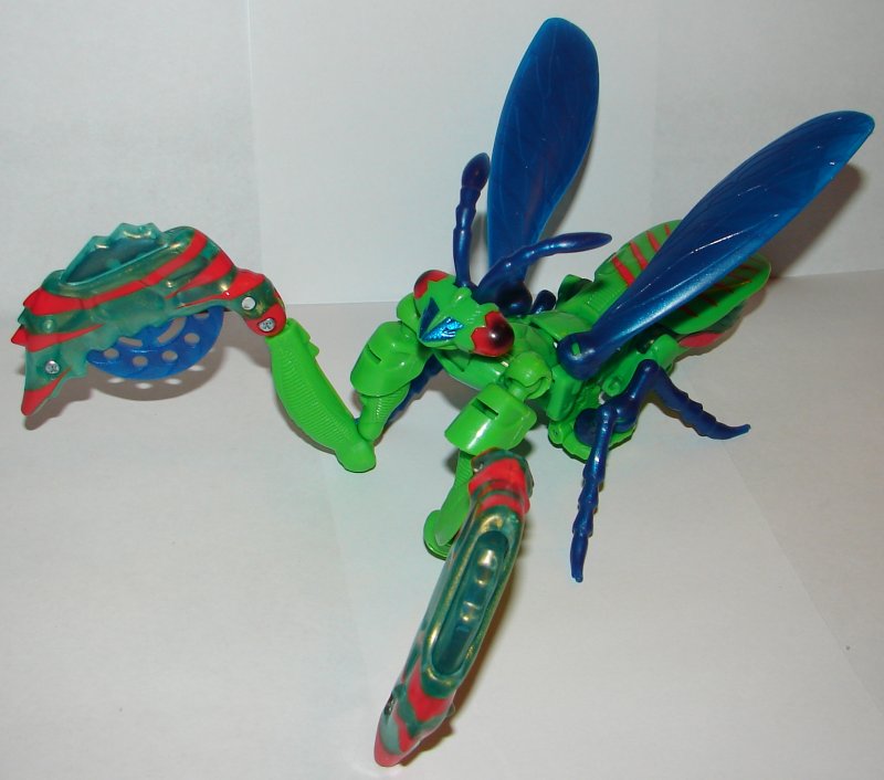 I really didn’t like Manterror, the American version of this toy, and I still don’t. Those crazy arm longs look fine in insect mode, but in robot mode they are awful. Mantis is a preying Mantis. His main difference from the American version is his wings, legs, and antennae, which are translucent gray on the American version. He really looks better in these colors. His claws contain disks that shoot.
