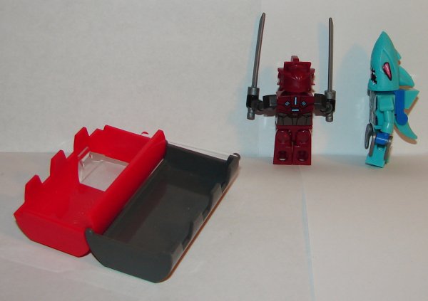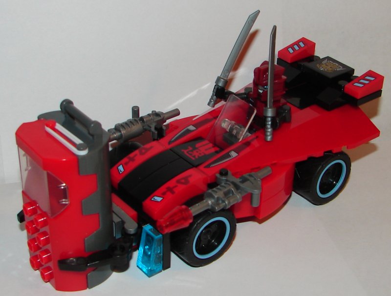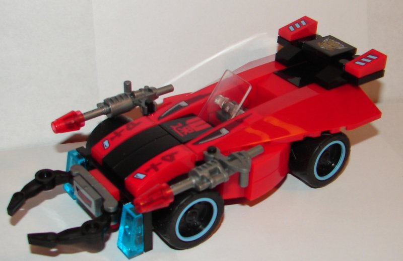 The set includes Kreons of Sideswipe and Hammerstrike. Sideswipe, like all Kre-O RID Autobots has art on his back as well as his chest. I love his two swords, but I wish he had a backpack that could hold them. I really like Hammerstrike, he looks great. The set also includes a pod that doubles as a trap for Kreons. Sideswipe’s vehicle is pretty cool, but I’d rather something that looks more like Bumblebee in size and that actually resembled Sideswipe.