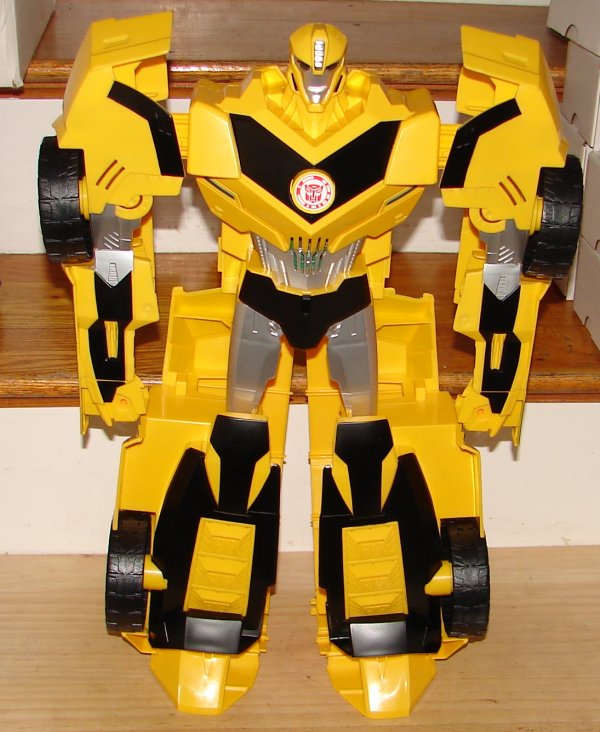 This Bumblebee is enormous. Unfortunately, like some other Three Step Changers, he doesn’t transform in three steps. If you’re lucky, he’s only two steps. Flip the vehicle grill over his head, and push his arms together. They say step three is to lie him down. It’s only two steps to transform him, what you do with him after that does not count. However, he may also take fifteen steps to transform. That’s how many steps are necessary to make sure his arms go in correctly, and to get all the little clips to line up on the two halves of the vehicle roof and back end. It’s insane. You have to have them, or the two halves won’t stay together, but having to line them up completely defeats the purpose of calling him a Three Step Changer.