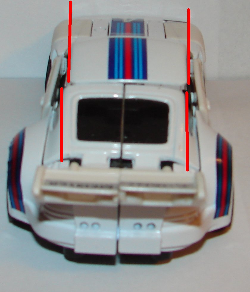 Back in 2002 Takara released a reissue of Jazz in Book Style or Dreamwave Art (call it what you like) packaging also known as The Transformers Collection. This version of Jazz included the slight mold differences that Generation 2 Jazz had. In addition, degradation of the mold led to a weird face mold and the misalignment of his roof and rear windows as shown with red lines in the below picture. His stickers were also modified.