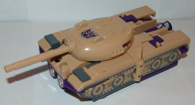 Back in 2005 Takara released a reissue of Blitzwing in book style or Dreamwave art (call it what you like) packaging also known as The Transformers Collection. This version of Blitzwing was modified from the original mold. Original G1 Blitzwings had removable tank turrets. If you turned the turret sideways you could pull it free of the body. The reissue has been modified so that it cannot be removed. I was tempted to dissemble it to see what was changed, but I only have one of these and they tend to be pricey on ebay. Unfortunately it’s not really possible to picture it not coming off, so you’ll have to take my word for it. The eHobby repaint Overcharge has the same molding.
