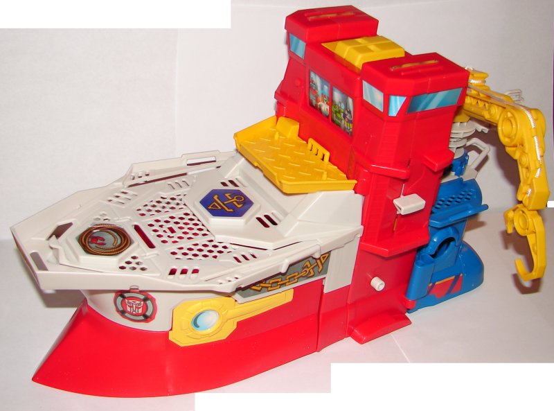 I am extremely disappointed in the Rescue Rig. In the cartoon it transforms into a robot. The toy does not. It does have some nice action features though. It has a crane on the back on a platform that can be removed from the boat itself.