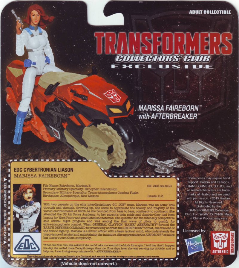 Here we have Marissa Faireborn. Never heard of her? That would be because she was only in five episodes of the original Transformers cartoon. Why would they choose to make an action figure of such a minor character you might be wondering? Well, that would be because she is supposed to be Flist’s daughter, as in Flist from GI Joe. The decision to make an action figure of such a minor character rather than figures of characters that matter like Spike (kid and adult) Sparkplug, and Daniel in unfathomable. Heck, there are far more memorable minor characters like Chip Chase who is also in five episodes. My objection to the selection of Marissa Faireborn is not as much that she was only in five episodes, but that it’s yet another decision to make toys that crossover to the clubs.