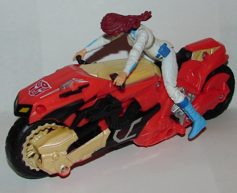 If you look at Afterbreaker right in front of her boot above there is a black peg. The original figure that came with this had holes in his feet or lower legs and these pegs were used to secure him onto the vehicle. That’s actually a pretty neat feature, but they failed to include the holes on her legs. So, she is only held on by her hands on the controls and legs on the bike. Unfortunately her leg joints are so loose, that it’s really only her hands which don’t hold on worth a damn.