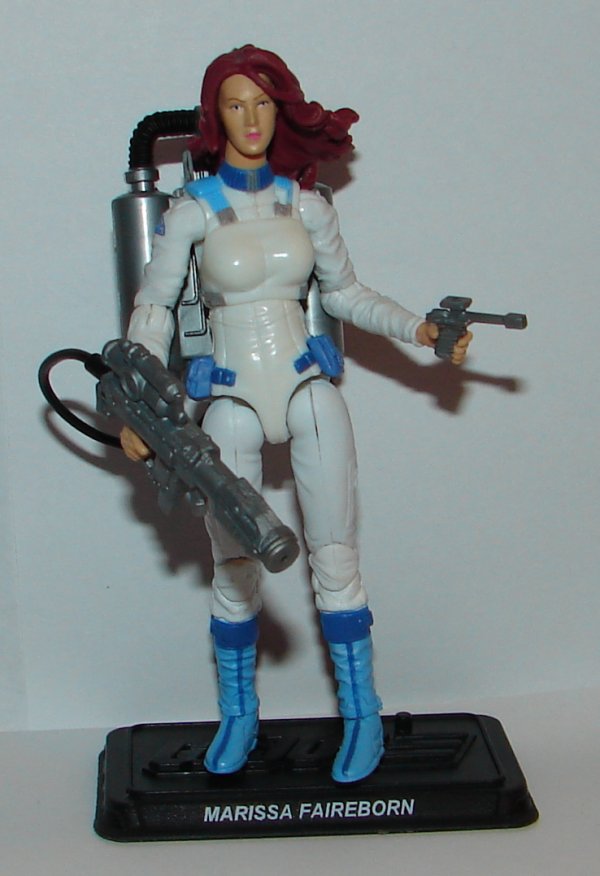 As to the figure, it’s a nice looking figure that to my recollection looks like Marissa Faireborne. I hate the windblown hair. It’s fine on the bike, but not on the bike it looks stupid, like she has her own personal fan to keep her hair flowing in the breeze. The biggest problem with this is that her hair gets in the way of putting on her jetpack accessory. Her small gun also barley stays in her hand because she’s molded out of incredibly cheap plastic.