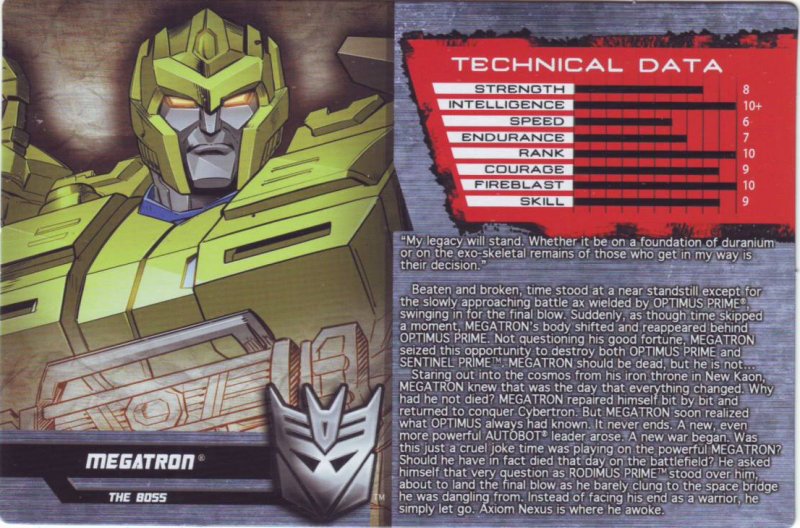Megatron’s Arms Micron partners have no names. I am sure someone will point out that they either put names online or in the comic book. Who cares? If a toy name is not included in or on the package, it doesn’t count. You should not need to go to a second source to get the name of the toy you bought. Never really liked the ape Micron, and Bulkhead’s Micron is so heavy that Megatron can’t hold it up. Note in the picture below that his left arm is lower than his right. He doesn’t have ratcheting joints and the weight is too much. When picking accessories for a toy they really should make sure the toy is capable of holding it properly. The mantis was a really nice idea as it can represent The Doctor from Revenge of the Fallen. Unfortunately, it looks pretty lousy without paint apps. Now, there is a sticker sheet pictured above that was given out at the Custom Class. It’s idiotic to give out stickers that a toy needs to a small number of people that went to an event that had NOTHING to do with this toy. So I don’t consider this sticker sheet in any way an official part of the toy but an aftermarket add on.