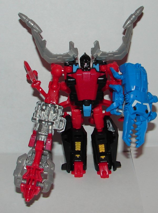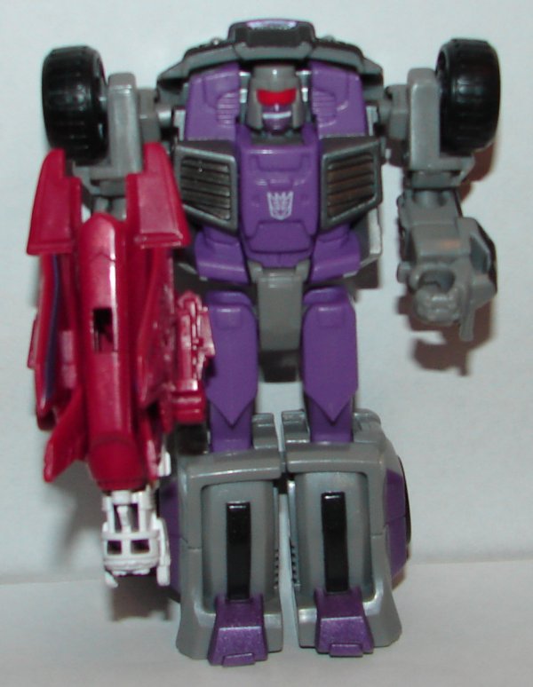Battletrap (formerly Duocon, now Triplechanger) is repainted from Generations Voyager Springer with a new head. His paint job is okay, but he needed some more paint apps, especially on his head. It’s a really nice head sculpt, but I would have liked to see something other than just his eyes painted. This is probably the best toy of the year if you ignore the obvious screw up. Hasbro has said, and thus far kept their promise, to complete teams. They are doing Mini Cars, Decepticons Jets, and Insecticons in the Legends line, and seem to plan to do them all. Pity Botcon can not do the same. While the Generations Voyager Blitzwing mold is not the greatest mold, it is the perfect mold to do Flywheels, the other Duocon. They should have done that instead of the deplorable General Optimus Prime toy as a souvenir. While Battletrap is a good toy, the lack of paint apps and Flywheels really takes away from him.