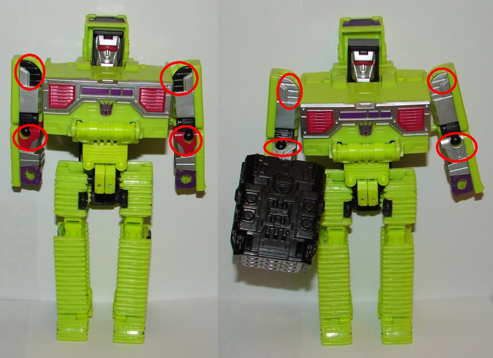 The SDCC version of Devastator differs in paint apps and stickers. The only mold change is a new head. The most obvious paint difference is the purple chrome, which unfortunately does not extend to the gun, which should have also been chromed. It looks pretty sharp, but I’m getting a little tired of Hasbro intentionally releasing substandard toys and then doing the proper paint job only on overpriced exclusive and platinum sets. Either do the toy right or don’t do it at all. In the pics below the red circles note the paint changes. Should be pretty obvious. The SDCC version is definitely the better of the two as it has the added paint apps and chrome. Hasbro really should have included the individual guns the Japanese version is coming with.