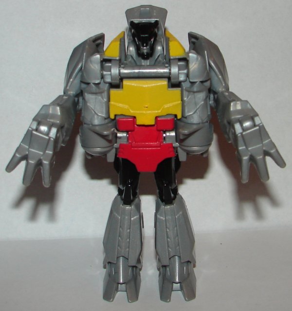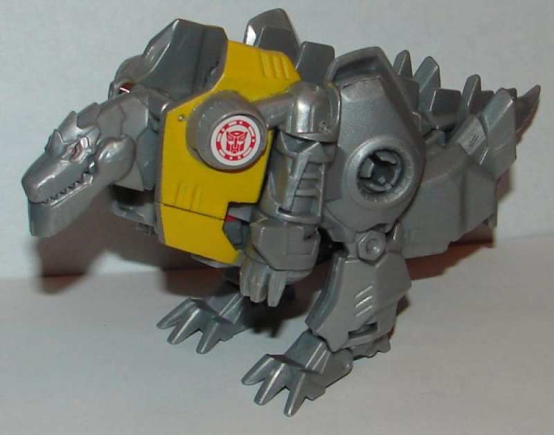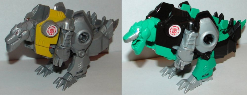 In dinosaur mode Grimlock is almost completely gray, except for the yellow around his shoulder area. In robot mode he is closer to G1 Grimlock in color, but this toy looked much better in black and green.