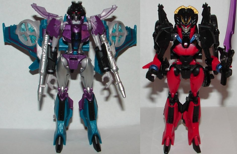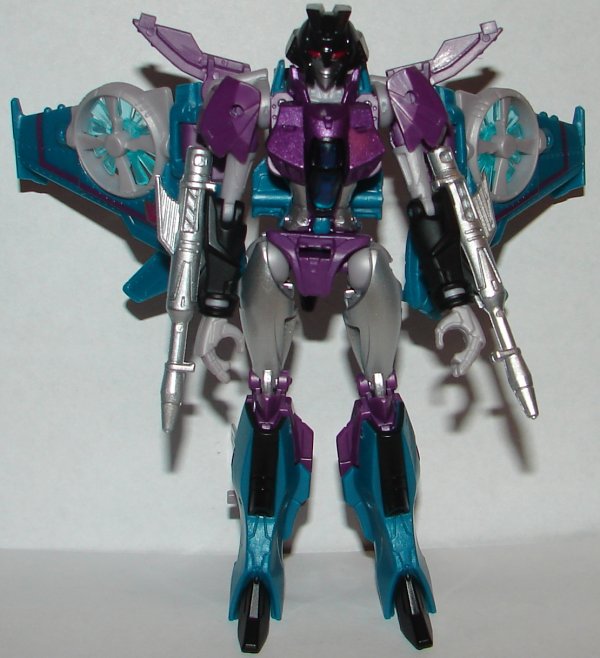 Robot Mode: In robot mode, she has new weapons that are like the typical seeker arm cannons, but does not come with Windblade’s sword. Her chest has been remolded, and she has a new head sculpt.