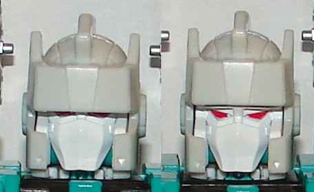 Titan Master: I really like Six Shot’s face sculpt. It’s very reminiscent of the G1. Unfortunately, the helmet is a different story. The G1 toy (and animation) does not have that plate on his forehead. In the picture on the left you can barely see his eyes. With the top of the helmet pushed slightly up and out of position it looks a lot better, but this is not proper transformation. I’m going to guess the plate is the work of the geniuses at IDW. (IDW, ruining Transformers since 2005.) If the plate was a little smaller and not covering his eyes, it wouldn’t bother me nearly as much. Also, his helmet is a little different than most of the other Voyager and Leader class toys. His helmet fully encloses the Headmaster. What this means is that his helmet could be removed in favor of a real head and it would not affect the transformation of the toy at all. If a third part company makes a G1 accurate replacement head, I might just have to get one.