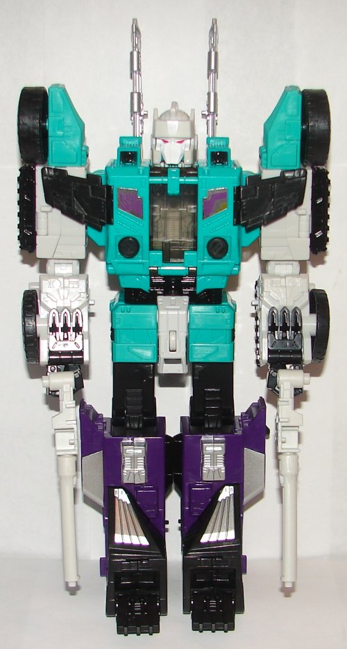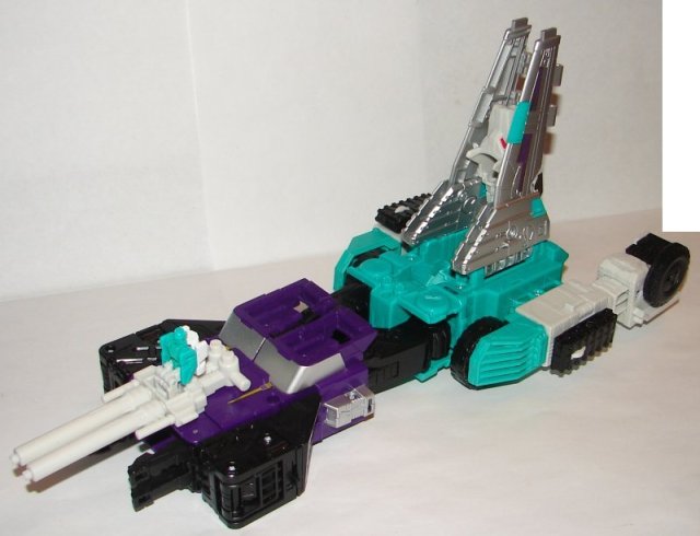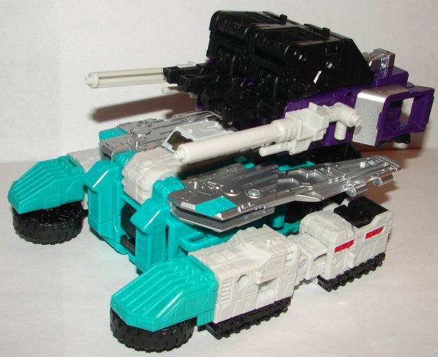 “Tank” Mode: The tank mode looks very much like the G1. I really like the look. Unfortunately, here is a prime example of the ratcheting joint issue. His robots arms form the sides of the tank and have the treads on the bottom. Since his shoulders don’t ratchet, they are only connected at the back. There is a wheel underneath in the middle of the vehicle to take pressure off the treads in front, as with the G1, but it’s hard to get the treads to stay properly aligned without correctly ratcheting shoulders. It could have been fixed by attaching the side of his arms to the body of the vehicle. This would have eliminated the need for the ratchet in this mode. His legs are flipped up over the vehicle to form weapons. His legs do not connect together. G1 Sixshot’s legs did not connect either, but his ratcheting legs and knees kept the two sides aligned. It is impossible to get these perfectly lined up.
