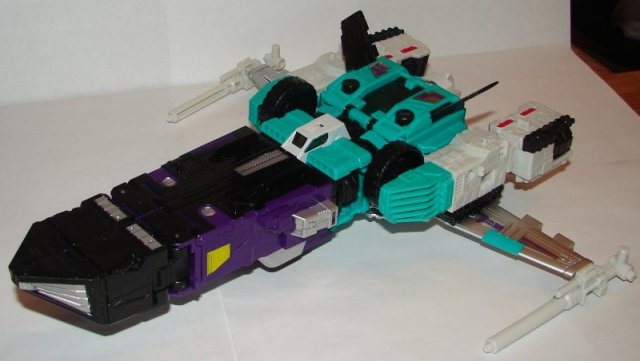 “Jet” Mode: Six Shot’s jet mode looks perfect, but looks can be deceiving. He does suffer from two minor and one major problems. One minor one is regarding his ratcheting shoulders. If you look at where the wing sits just under his arm, you’ll see that his tread is resting on the wing. This does keep it in place because the wing is locked in place. If his shoulder ratcheted then you could flip those treads up to the side, and off the wing, but they are all that is keeping his arms in place in this mode. As I said, this one is minor, but I would have preferred his arms not sit on the wings, or alternately peg into the wings. The other issue is that in jet mode, his helmet is visible on the back of the vehicle. It has to be flipped out so that his Titan Master can go inside where his head would be. This is a direct effect of making a toy that was not a Headmaster into a Headmaster. Now for the big one. His hips ratchet, but as I said, they have a lot of give to them. Consequently, the front of the jet (his robot legs) doesn’t stay lined up with the rest of the vehicle. There are two tabs that appear to be designed to hold this all in place, but I can’t get them to stay in.